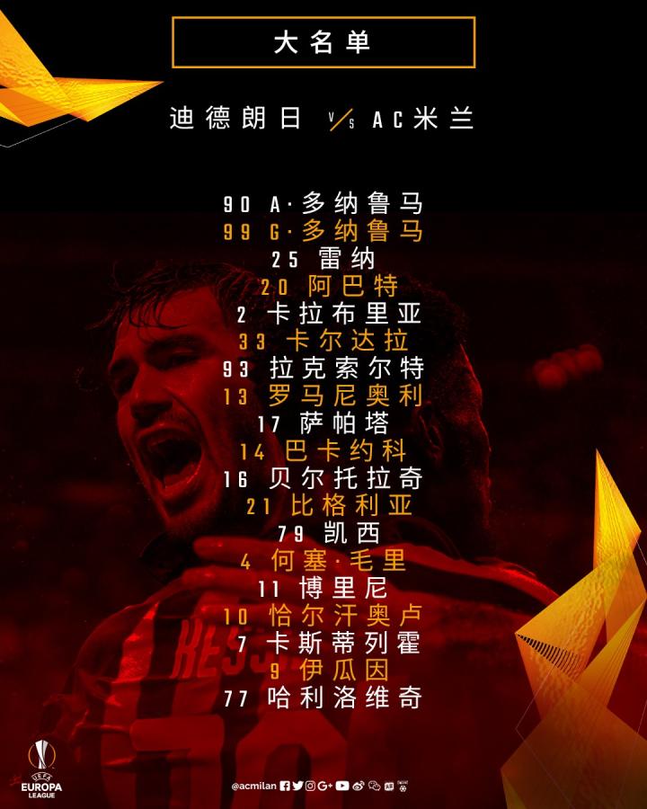 【迪德朗日 vs AC米兰】球队19人大名单公布: