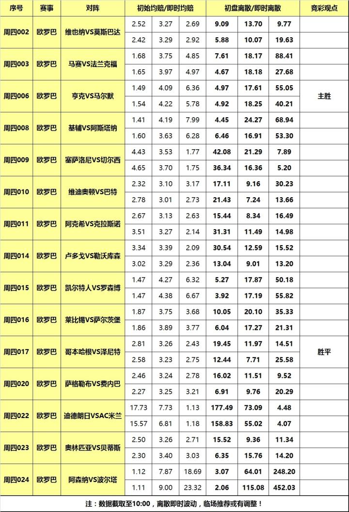 [关于离散] 是竞技彩票特有分析指数,指数基于百家欧赔即时赔率分歧度。基本原理是:百家欧赔平均值与每家赔率差值的绝对值的求和。离散度小则赔率公司观点接近,进而 彩果易打出,离散度大则反之意见分歧大,彩果不易打出。又因庄家操盘/变赔影响,离散低则概率高理论并非放之四海而皆准,需结合盘赔和基本面等信息综合运 用。简言之,离散是参考指标,而非填单依据!以下是各场数据汇总(数据截取至10:00):