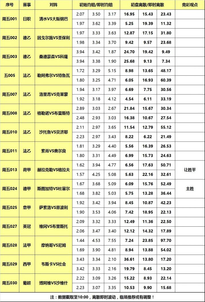 周五重联赛模式,下午日职1场早场,晚间法系和荷系赛事依旧是主流,两国联赛共计16场入围。另外五大联赛除英超外均有早场安排,摩纳哥、皇家社会和斯图加特今晚都将出战。周五赛程共计安排多达35场,早间档精选分享日职和欧洲联赛15场指数,另附德甲和荷甲2场早场解读!晚间分享全部15场临场离散,另附竞彩/亚盘观点全解,加送精选亚盘和串关主推,欢迎搜索关注“大嘴聊球”号获取!