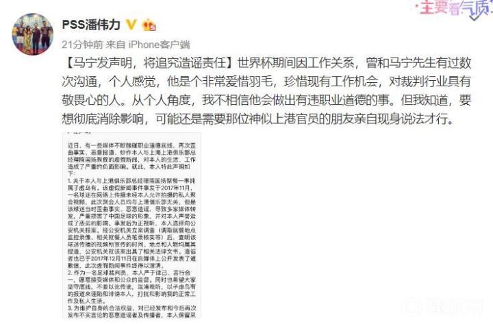 同时,潘伟力本人也在微博中表示:“世界杯期间因工作关系,曾和马宁先生有过数次沟通,个人感觉,他是个非常爱惜羽毛,珍惜现有工作机会,对裁判行业具有敬畏心的人。从个人角度,我不相信他会做出有违职业道德的事。但我知道,要想彻底消除影响,可能还是需要那位神似上港官员的朋友亲自现身说法才行。”