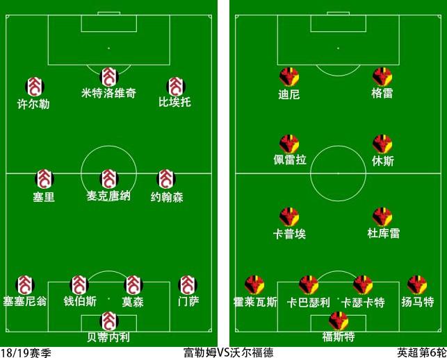 沃特福德客场作战派出了与上场一样的首发阵容,对于球队而言也是现有的最强的阵容,碍于德乌洛费乌的受伤依然用休斯代打右边路,沿用英超场上许久未见的4-2-2-2阵型。主队富勒姆这边在后方线上有所调整排上了钱伯斯和门萨。