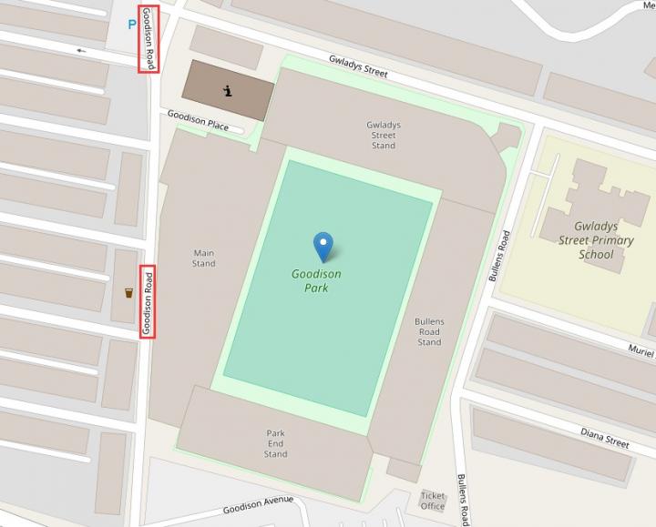为什么要命名为古迪逊呢?因为球场一侧紧挨着古迪逊路(Goodison Road),这条路得名于本地土木工程师George Goodison,所以埃弗顿将球场命名为古迪逊公园。因此球场名字与那种供人们休憩的公园没有任何关系,名字里面的“Park”可能指的就是球场这种综合体。
