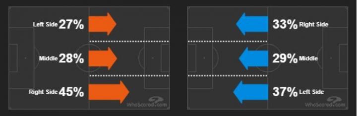 (图)双方进攻方向示意图,国际米兰右路占比达到45%