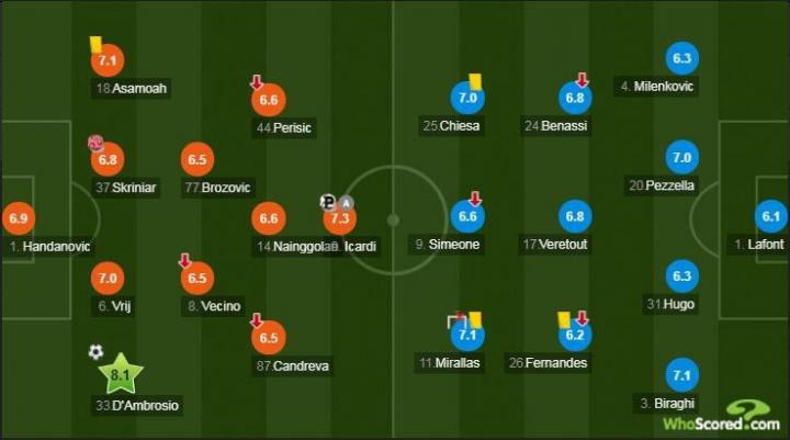 而国际米兰的前场逼抢,跟前两场一样,都持续了30-40分钟以上。这样的逼抢力度让国际米兰在上半场占据了优势,双方上半场射门次数为10-4。佛罗伦萨上半场仅有的两次威胁进攻一次来自于国际米兰前场逼抢失败后的快速反击,另一次则是布罗佐维奇后场非受迫性失误送礼。