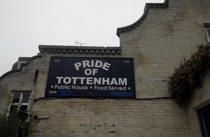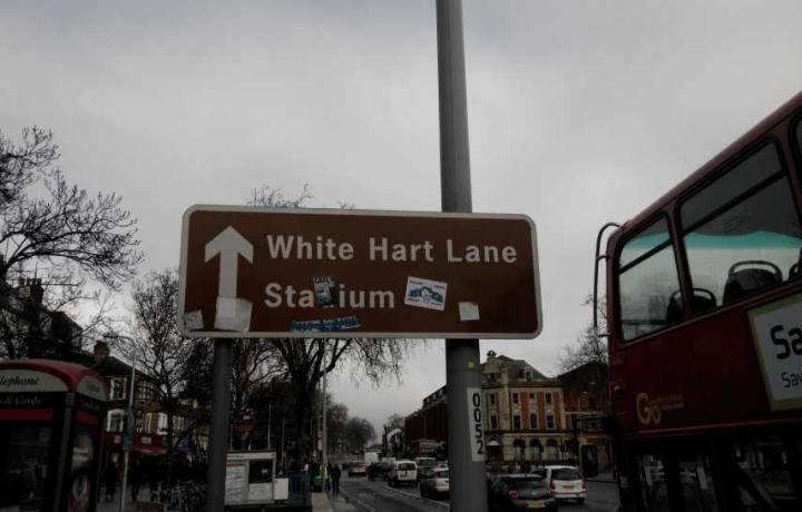 之前朋友有对我说过,热刺球迷对待阿森纳球迷的方式是极度野蛮的,在他们的主场不要穿戴任何阿森纳的衣服围巾,不能暴露自己枪迷的身份,否则可能会惹上大麻烦。因此,出发之前我把阿森纳的球衣、围巾和旗都放到了的包里的最底下。一下地铁,首先看到的是路边一个标示着“前方是白鹿巷”的指示牌,上面贴满了各种小广告,然而此处距离白鹿巷尚有两公里多。