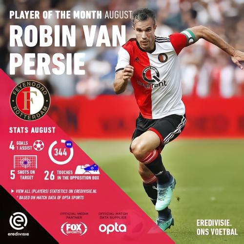 本赛季开始7轮范大将军已经打入6球还有1次助攻,排在荷甲射手榜前列,帮助费耶诺德与阿贾克斯同积16分,并列积分榜次席。35岁的范大将军依然拥有着良好的状态和高效的进球数,值得一提的是同为35岁的荷兰前国脚亨特拉尔也以6球1助攻在射手榜上与范大将军并驾齐驱。