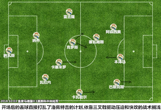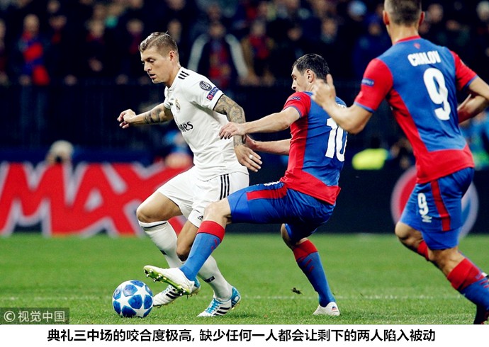 开场仅仅1分07秒,皇马城门便宣告失守,莫斯科中央陆军依靠前场压迫逼迫皇马守将犯错,克罗斯在边线附近的凌空回传被弗拉西奇抢断,后者在禁区前沿扣过瓦拉内后左脚低射入网,这粒进球是皇马近期在反压迫阶段表现不力的一个缩影。尽管从赛季开打至今已经表现出了明显的衰退迹象,但莫德里奇的持球推进依然是皇马中场架构中不可缺少的一环。中央陆军敢于在开场阶段倾巢出动,就是因为他们不用担心身后的空间,皇马没有球员能够凭借个人能力制造纵深。