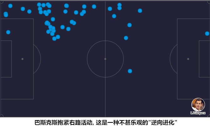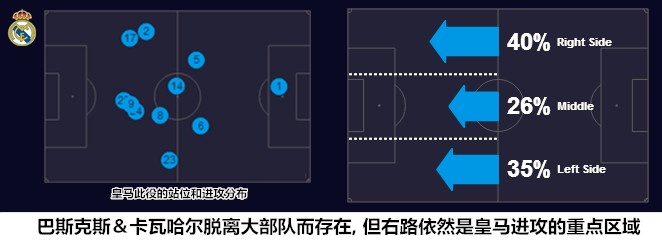 在马塞洛缺阵的情况下,塞瓦略斯和阿森西奥组成的左路缺少足够多的变化,右路成为了皇马的主要进攻通道。不过,皇马的强侧配置存在着打法重合的问题,巴斯克斯和卡瓦哈尔都是走外线寻求传中机会的打法,替补出场的奥德里奥索拉也是如此。在上赛季最困难的时期(国王杯出局),齐达内提携阿森西奥&巴斯克斯主打平行442以恢复边路传统,在这个过程中,巴斯克斯开始注意减少右路持球强攻的频率,更多地移动到中路参与传切配合,捕捉反越位攻击球门的机会。从过往专注于服务C罗的右路传中机器,到如今注重内线进攻的“影锋”,巴斯克斯的进化原本可以让他更好地适应洛佩特吉的战术,因为皇马在C罗离队后必将减少边路传中的频率,增加中路进攻的比重。