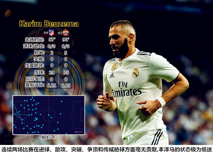 在此前的马德里德比中,本泽马多次射门被对手封堵,核心力量衰退导致动作速率减慢已经严重影响他在门前一击时的效率。在对阵中央陆军的比赛中,本泽马完成了5次射门,两次禁区外的射门中有一次被对手封堵,3次禁区内的攻门有两次命中目标,考虑到皇马此役拥有72%的控球率和37次传中,头号中锋刷出这样的数据实在是无法令人满意。