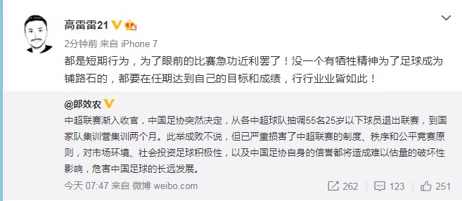 高雷雷转发了中国足协原联赛部主任郎效农的微博,他也评论道:“都是短期行为,为了眼前的比赛急功近利罢了!没一个有牺牲精神为了足球成为铺路石的,都要在任期达到自己的目标和成绩,行行业业皆如此!”
