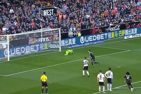 (图)2015年瓦伦西亚和皇马的比赛甚至出现了“祝皇马·巴萨踢出真爱”的广告语
