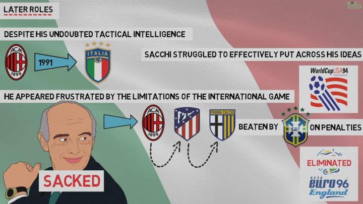 1991年,他离开米兰执教意大利国家队,但他似乎没能真正找到驾驭国际比赛的状态,萨基带领意大利进入了1994年世界杯决赛,但他们在点球大战中被巴西击败。