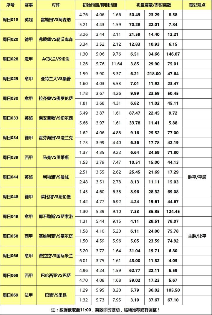 [关于离散] 是竞技彩票特有分析指数,指数基于百家欧赔即时赔率分歧度。基本原理是:百家欧赔平均值与每家赔率差值的绝对值的求和。离散度小则赔率公司观点接近,进而 彩果易打出,离散度大则反之意见分歧大,彩果不易打出。又因庄家操盘/变赔影响,离散低则概率高理论并非放之四海而皆准,需结合盘赔和基本面等信息综合运 用。简言之,离散是参考指标,而非填单依据!以下是各场数据汇总(数据截取至11:00):
