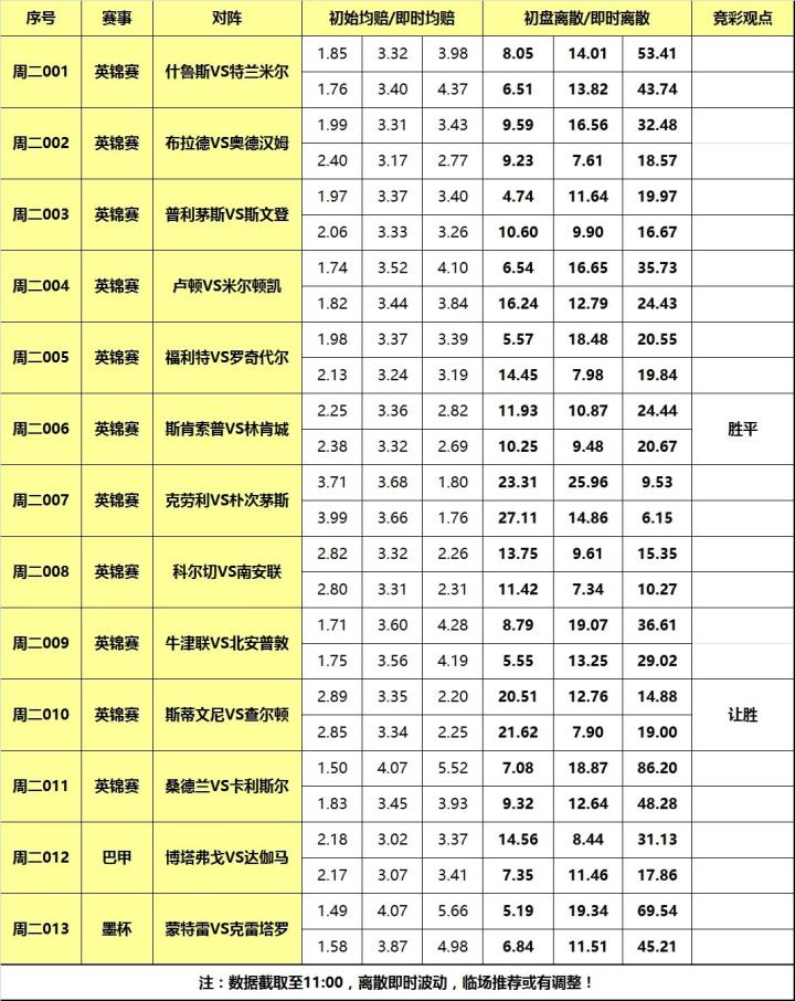 [关于离散] 是竞技彩票特有分析指数,指数基于百家欧赔即时赔率分歧度。基本原理是:百家欧赔平均值与每家赔率差值的绝对值的求和。离散度小则赔率公司观点接近,进而 彩果易打出,离散度大则反之意见分歧大,彩果不易打出。又因庄家操盘/变赔影响,离散低则概率高理论并非放之四海而皆准,需结合盘赔和基本面等信息综合运 用。简言之,离散是参考指标,而非填单依据!以下是各场数据汇总(数据截取至11:00):