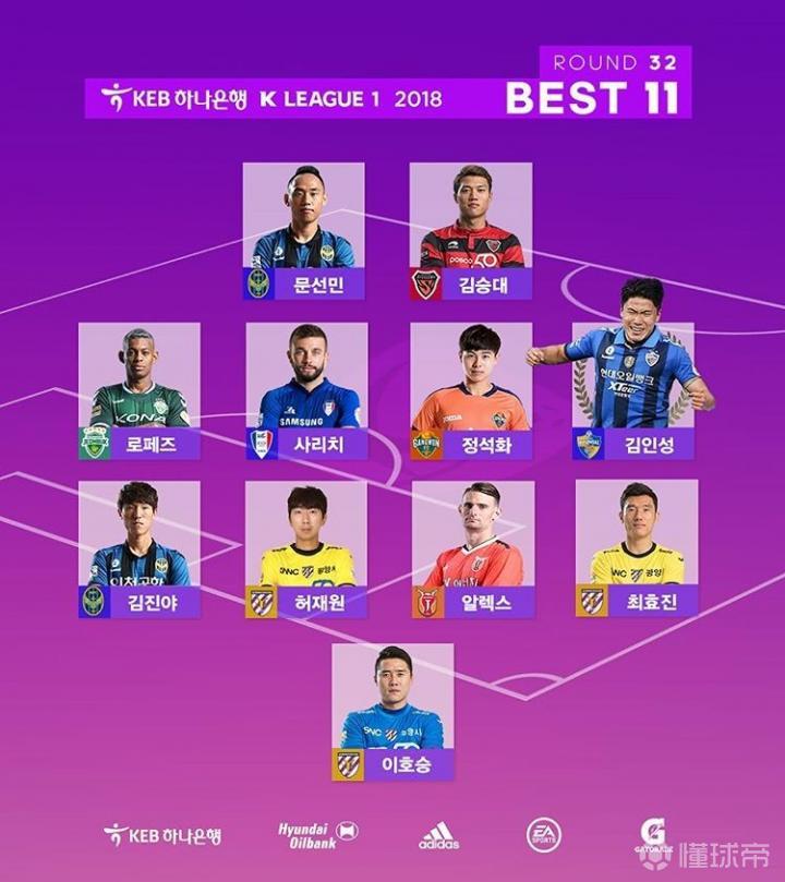 韩国K联赛官方公布了第32轮K1联赛的最佳阵容,浦项制铁前锋金承大等人入选。