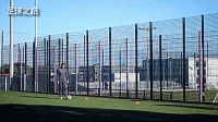 这是一个帮助边后卫提高很有效的训练方法,我们在中间放一个标志盘,你还需要一个队友或者一面墙,然后在中间标志盘两侧相距十步的位置各摆放一个小门。
