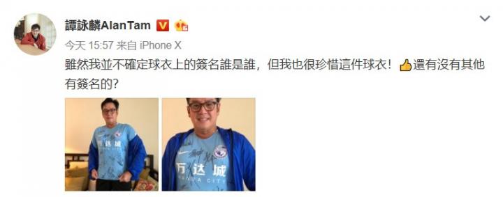 谭咏麟在微博中写道:虽然我并不确定球衣上的签名谁是谁,但我也很珍惜这件球衣!还有没有其他有签名的?