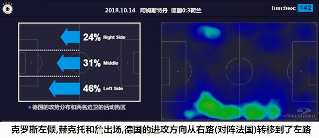 一个月前对阵法国时,穆勒和金特尔所在的右路是德国队的主攻方向,此役,赫克托、维尔纳和克罗斯所在的左路区域成为了进攻强侧,金特尔多次助攻到前场都没有得到了队友的传球,这足以说明客队坚决主打左路的态度。德国队的左路进攻一般有两条线路:乌特占据肋部,赫克托在中场附近的边线处站位,克罗斯持球吸引防守,维尔纳拉边寻找外线一对一突破的机会;克罗斯快速斜传身后,维尔纳从荷兰边卫和中卫的结合部发动反越位冲击。面对德国人的进攻,荷兰队的两名中卫发挥出了极高的水准,范戴克成功肩负起了防线指挥官的重任,德里赫特对邓弗里斯身后空间的保护非常到位,阿贾克斯中卫几乎赢下了全部的一对一对抗。由于中场的防守压力比较大,埃姆雷-詹鲜有进入禁区抢点的经历,德国队的阵地进攻缺少足够的侵略性和层次感。
