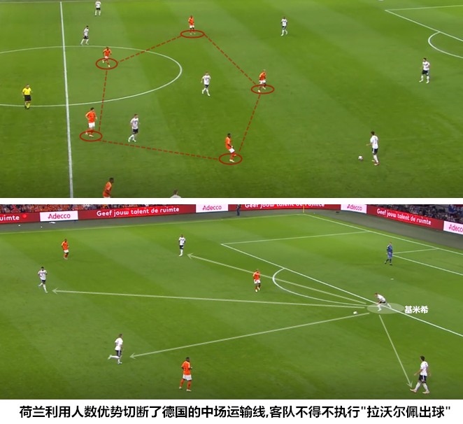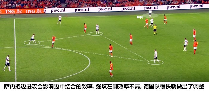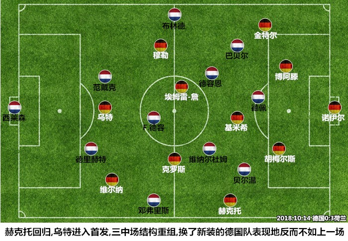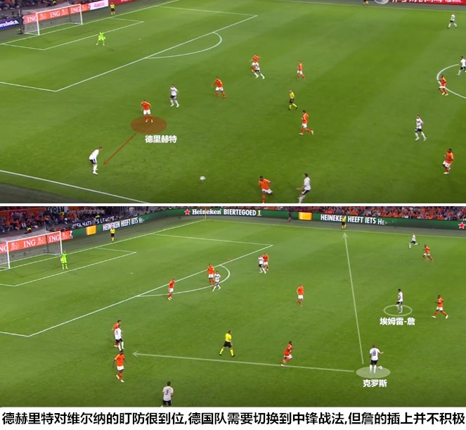 主场作战的荷兰队表现地积极主动,球员在完成技术动作时非常放松,局部的小组配合和对横向空间的利用都很到位,“英超系”的布林德、维纳尔杜姆和德佩之间多次凭借快速出球和一脚传递撕开德国队的防守。由于很多球员的状态都比较一般,维尔纳和乌特等人也需要一定的冲刺空间,勒夫没有驱动高位压迫而是将防守的重心设置在中场,克罗斯和埃姆雷-詹向前配合三名前锋组成第一道防线,四名后卫适时上抢挤压对手。