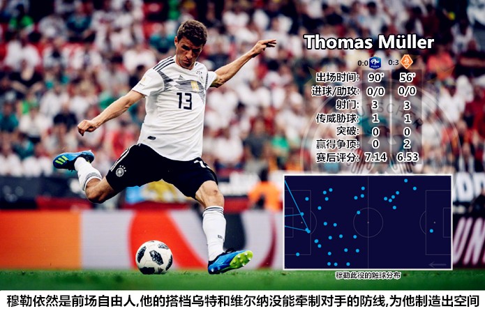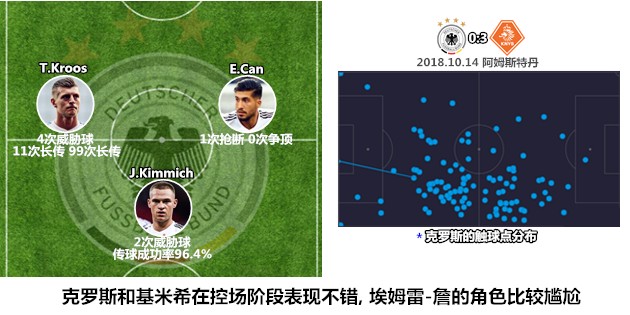 除了依靠强力中卫做好低位防守以外,荷兰队也在中前场给予了对手很大的压力。由于首发球员的运动能力很强,主队能够依靠不断的整体移动建立起多层防守网络,两段高强度压迫之间的间隔时间很短。埃姆雷-詹和克罗斯都不具备持球摆脱防守的能力,基米希习惯于沉入中卫之间接球后再正面持球向前,此举固然有利于出球,但也会拉长中场运输线,锋线球员的接球位置不可避免地后移,背身能力不足的维尔纳和穆勒在回撤接球时很容易被对手抢断。此役,克罗斯用90%的传球成功率完成了99次传球,这两项数据较之此前对阵法国队时有所提升。中场核心的战术权重不低,但德国队却在疏导球路和进攻铺垫阶段多次出现混乱,这说明勒夫在赛前战术部署阶段并没有对很多战术细节作出明确要求,亦或是球员们在执行战术时出现了很大的问题。