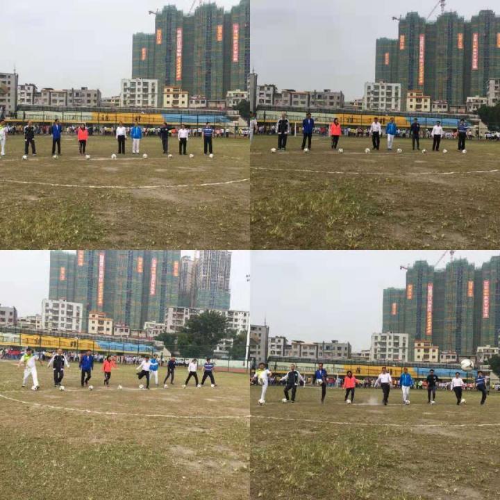 嘉宾领导们为四会市“富力·市长杯”青少年校园足球联赛拉开揭幕战开球仪式。