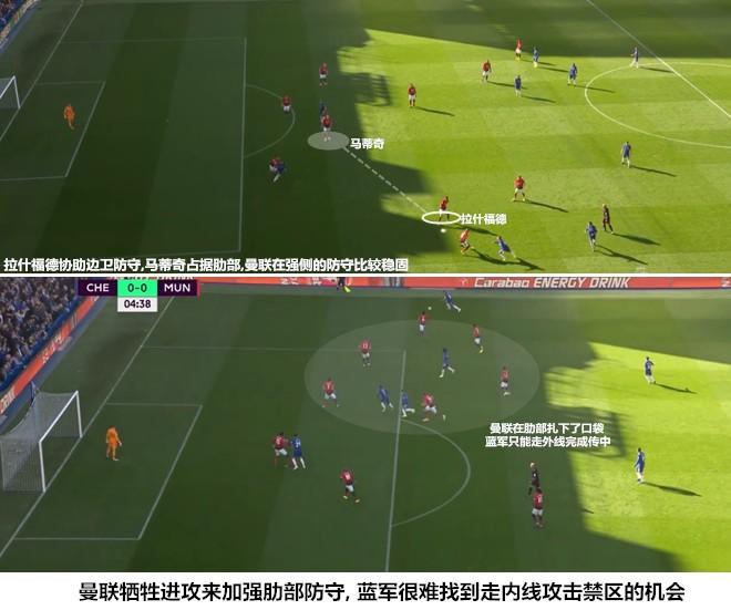 蓝军持续围攻不能扩大比分,曼联两次反击便反超了比分,萨里的球队在体能下降后无法给予对手足够的压力,球队很容易在退防过程中出现问题。孔蒂的三中卫体系在低位的轮转效率较高,禁区附近不容易被对手直接利用传切配合打穿,四后卫体系的后场空间较大,对球员个人防守能力要求更高。很多蓝军球员还没有适应从三中卫到四后卫体系的转变,缺少体系的支撑和队友的保护,部分特型球员(马科斯-阿隆索&若日尼奥)的技术缺陷很容易暴露了出来。