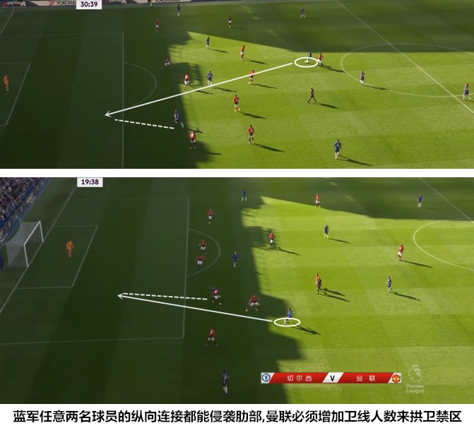 曼联轻易地放弃了高位逼抢,切尔西则十分看重丢球后的就地反抢。主队的策略是丢球后第一时间在强侧形成绞杀,限制曼联通过地面传递完成反击,迫使他们用长传球发动进攻,蓝军的两名中卫都具备跑动能力出众、覆盖面积大的特点,他们可以很好地拦截对手的长传来组织起二次进攻。萨里在上任后放弃了运动能力不足的卡希尔和克里斯滕森,确立了一个传球和摆脱能力很强的后场铁三角,这是蓝军能够顺利实现控场的基础。穆里尼奥在开场阶段安排马塔和卢卡库盯防若日尼奥和大卫-路易斯,被放空的吕迪格获得了不少施展长传的空间,马科斯-阿隆索和阿扎尔等人都在德国人的指引下杀入曼联的禁区。