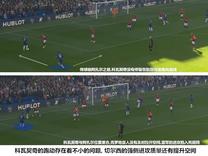 作为阿扎尔在左路时的主要帮手,科瓦契奇的表现也欠缺说服力。科瓦契奇在皇马时期的主要任务是利用强大的突击能力完成从后场到中前场的推进,来到切尔西之后,科瓦契奇持球发动进攻的位置要比以往前移了不少,要在对手的防守核心区完成大范围突防并不容易,必须要通过与队友的配合才能完成肋部钻营。科瓦契奇的技术能力能够支撑复杂的肋部进攻,克罗地亚人需要时间来提升与队友之间的默契度,如何通过跑动为持球的阿扎尔吸引防守就是他需要尽快掌握的战术要领。