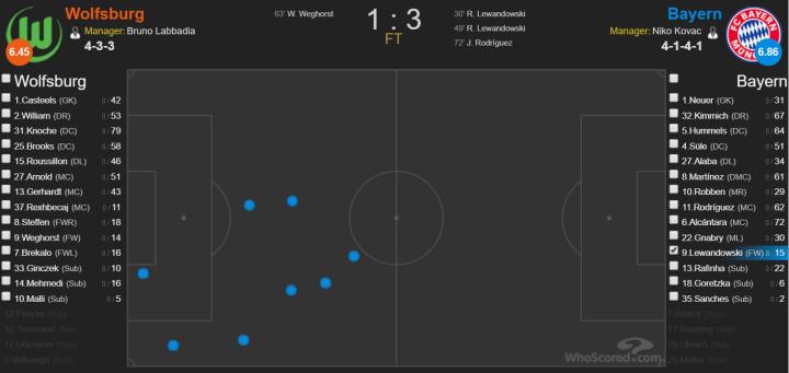 这样的调整渐渐磨掉了狼堡反击的心气,使得后者只能用反击来尝试威胁诺伊尔的球门。等到莱万终于利用回撤送出助攻,J罗把比分优势重新扩大成两球,主队实际上已经打出了GG。