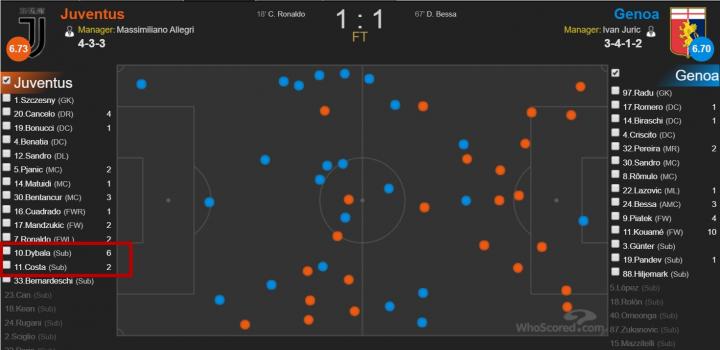 然而就像以前那些大保健浪掉的比赛一样,尤文就算不停派出板凳上最好的攻击手,也没能重新找到进攻的感觉。再加上心态愈发急躁,到最后基本上只剩下了强行依靠个人能力。但在这场比赛里,无论是迪巴拉还是科斯塔都显然不在最好的状态。不是前者控球失误,就是后者强行过人带出边线。