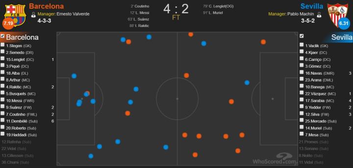 而在塞维利亚这边,他们针对性打塞梅多身后的部署也没能取得预想中的成果。虽然塞梅多本场比赛极强的进攻欲望带来了身后的大片走廊,但在身后补位的皮克经过国家队比赛日的休整之后状态明显好转了许多,上半场他完成了队内最高的2次拦截,并且全都发生在补防右路的过程中。