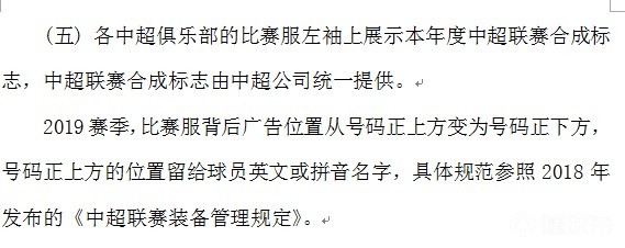 根据《中国足球协会超级联赛商务管理规定》第十章《中超联赛装备权益的实施》第三十八条第五项:各中超俱乐部的比赛服左袖上展示本年度中超联赛合成标志,中超联赛合成标志由中超公司统一提供。2019赛季,比赛服背后广告位置从号码正上方变为号码正下方,号码正上方的位置留给球员英文或拼音名字,具体规范参照2018年发布的《中超联赛装备管理规定》。
