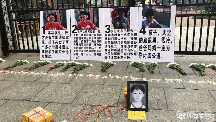 根据微博用户“真子555”于前天发布的微博,她的儿子在23号上体育课时被足球门砸到,不幸离世。