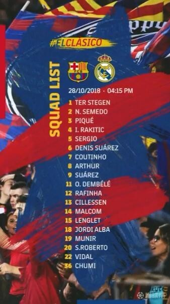 巴塞罗那公布了国家德比名单,梅西、乌姆蒂蒂、维尔马伦伤缺,其余主力球员悉数在列,阿图尔、德尼斯-苏亚雷斯入选。