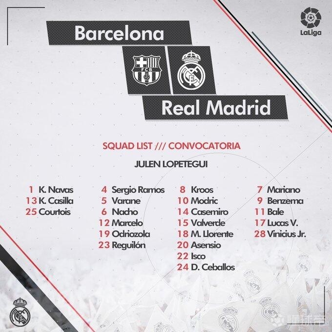 皇马公布了西班牙国家德比战对阵巴萨比赛的球队大名单,贝尔和本泽马领衔了皇马的大名单,与此同时年轻小将维尼修斯也进入了这份大名单,而队内的卡瓦哈尔依旧因伤高挂免战牌。