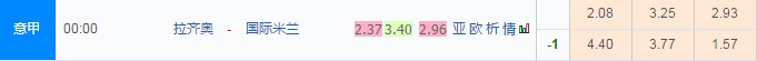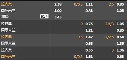 欧洲体育数据公司本场比赛的初盘给出了主让平半盘,在两队过往交锋处于明显劣势的情况下拉齐奥依然得到了该体育公司的高看。同时受注后上盘水位持续走高,目前已经来到了平半高水,对于上盘的保护力度十足。国米本赛季的表现非常抢眼,尤其是在最近的一段时间,这就会使得下盘拉力十足,这样更可能是一种对上盘的保护。