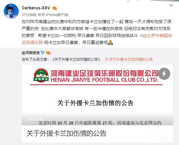 北京时间10月28日晚,中超联赛第27轮,河南建业主场2-0战胜北京国安,拿到保级的关键三分。河南建业的外援前锋卡兰加在比赛中出现了受伤,赛后被诊断为脾脏破裂,积血严重。目前已完成手术,正在康复中。今天,北京国安球员郭全博回忆了比赛的情形,并为卡兰加送上祝福。