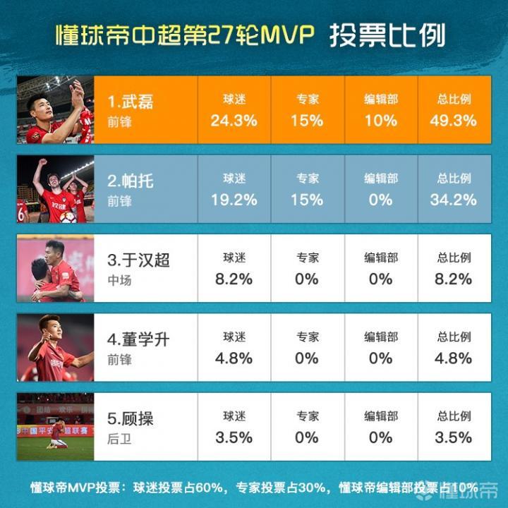 懂球帝中超第27轮MVP:武磊大波儿 @懂球帝2018-10-31 20:00大家晚上好,欢迎来到懂球帝2018赛季中超MVP的评选现场。在第27轮的比赛中上港4-2战胜鲁能,武磊梅开二度,斩获中超百球,综合三方投票,他当选懂球帝中超本轮MVP!注:在昨晚的中超MVP评选过程中我们的计票系统出现了问题,导致总票量异常。经过技术同事的抢修,数据已于凌晨1点左右恢复正常。向大家致歉。武磊梅开二度GIF投票比例专家意见编辑部意见四位获提名球员展开更多
