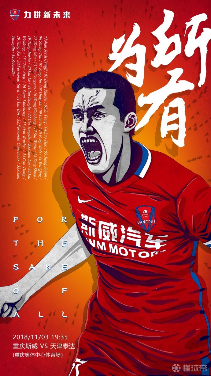 北京时间11月3日晚19点35分,2018赛季中超联赛第28轮将在重庆奥体中心体育场迎来一场至关重要的保级大战,重庆斯威坐镇主场迎战来访的天津泰达。今天上午,重庆斯威足球队官方发布了本场比赛的赛前预热海报,主题为:为梦,为爱,为所有。