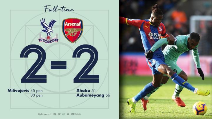 阿森纳上轮做客塞尔赫斯特公园球场迎战德比对手水晶宫。扎卡和奥巴梅杨的进球一度领先对手,但最终水晶宫凭借米利沃杰维奇的点球梅开二度主场2-2逼平阿森纳,终结了你厂的11连胜记录。