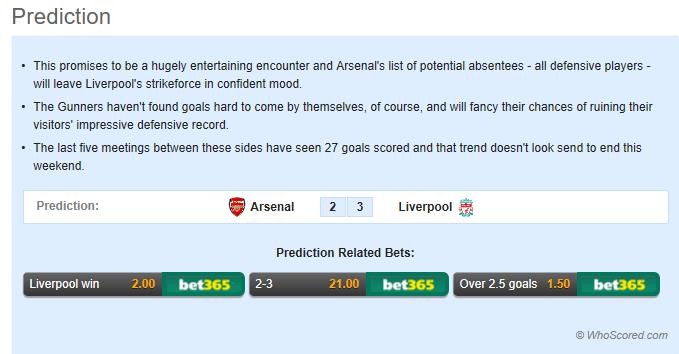 Whoscored给出的比分预测中,阿森纳将2-3憾负利物浦。笔者认为考虑到过往两次阿森纳主场迎战利物浦的战绩,这样的预测不无道理,而且如今利物浦的防线已经升级,枪手想要打穿则更为困难。笔者较为推荐1-3和1-2的比分。