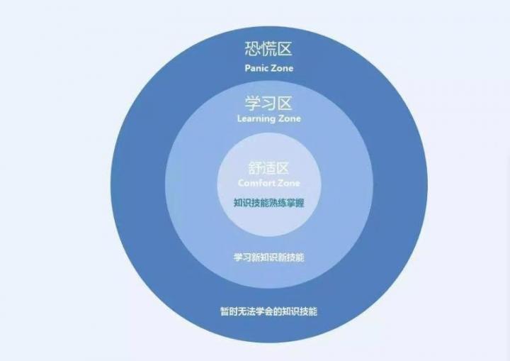 4、刻意练习要注重有效练习,注意练习质量。心理学家把人的技能学习分为层层嵌套的三个圆形区:从里往外分别为“舒适区”、“学习区”和“恐慌区”。“舒适区”是我们已经熟练掌握了的技能,“恐慌区”是我们暂时无法学会的内容。