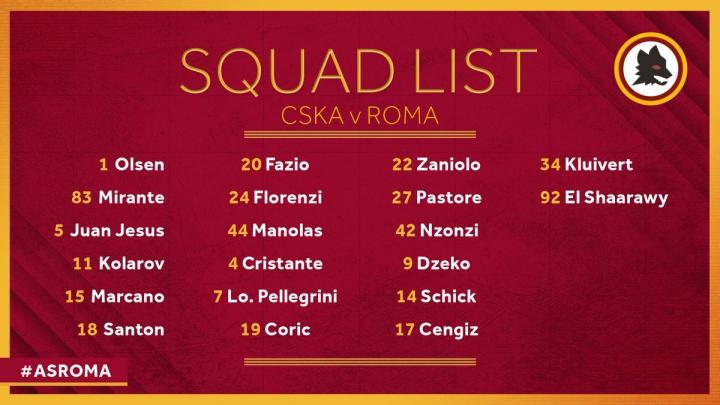 罗马官方公布了出战当地时间周三客场与莫斯科中央陆军的欧冠小组赛的大名单,队长德罗西缺阵。