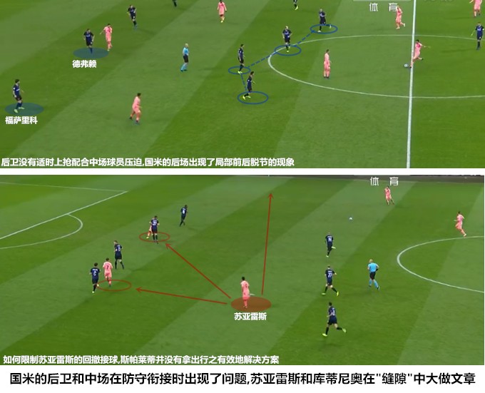 造成国际米兰在场面上陷入被动的原因有两点:一是尽管有了首回合较量作铺垫,但他们并没有熟悉巴萨在现阶段的作战模式,放弃稳健的低位防守转而实施中前场绞杀并不是明智之举。在没有梅西的情况下,巴萨在中前场压迫方面表现地非常积极,很多球队(包括国米)都低估了阿图尔的上位对巴萨中场控制能力带来的提升效果,他们在短时间也还没有找到限制以苏亚雷斯为核心的流动进攻体系的方法。