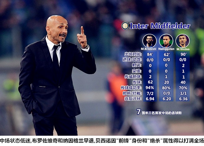 在国际米兰倾巢出动试图扳平比分的时候,布罗佐维奇领衔的中场很好地掌控了比赛节奏,主队得以在短时间内连续攻入前场30米区域。曼奇尼在二进宫之后曾引进英超球员(维迪奇&波多尔斯基)来加强球队的冲击力,试图以边路提速助力中路强攻,恢复曼一期时的高举高打。崇尚进攻的斯帕莱蒂在前任的思路中找到了灵感,他们在逆转热刺时依靠的是边路球员的车轮战和接力跑,在对阵巴萨时则启用了双前锋战术,劳塔罗-马丁内斯不辱使命。