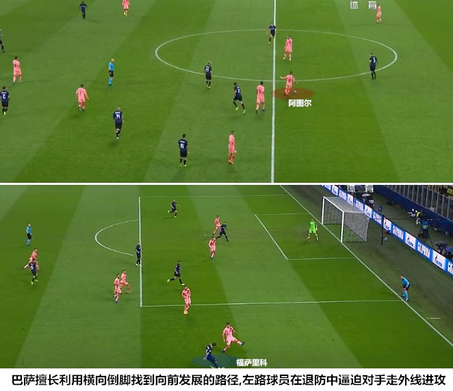 二是国际米兰自身的阵型架构和进攻组织存在一定的问题。蓝黑军团此役的451阵型在推进时展开为4141,纳因格兰和贝西诺都是擅长前插进攻的球员,阿萨莫阿和福萨里科多次同时进入前场40米参与进攻,球队在进攻中的兵力投入十分可观。不过,斯帕莱蒂的球队做出了全员参与进攻的姿态,但他们对球权和空间的利用却并不充分。边后卫和边前卫之间缺少呼应以外,中路球员之间的配合失误率很高,国米很难依靠传切配合突破对手在中场的封锁线,一人传中、多人抢点的进攻模式一旦不能拿下第一落点形成攻门,巴塞罗那的反击就会接踵而至。