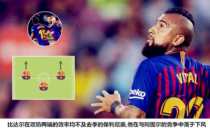 在斯帕莱蒂换上博尔哈-巴莱罗加强中场控制的时候,阿图尔的提前离场却为巴萨埋下了隐患。比达尔在赛季前期不得志,一方面是因为他的技术水平达不到要求,另一方面就是因为他在攻防两端的效率都不高,不能扬长避短就会拖累球队,谨慎的巴尔韦德很难在本就有些脆弱的中场体系中加入这样的球员。巴尔韦德在上赛季重用保利尼奥,不仅仅是因为巴西国脚能够以临时中锋的身份为苏亚雷斯减压,更在于其既能保证插上后的进球效率,还可以在防守中提供杰出的贡献。梅西、苏亚雷斯和库蒂尼奥的向前传球往往都具备球速较快且隐蔽性强的特点,这对后插上球员的预判、跑位、接球以及技术调整能力有着很高的要求,比达尔还需要时间来适应队友的打法,智利人现在首先要要做好的是提升传球稳定性(此役传球成功率96%)和防守贡献度。