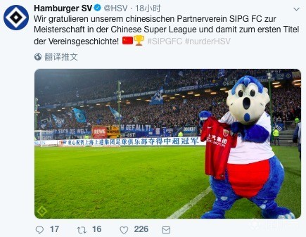 汉堡俱乐部官推在上港夺冠后,发布了一张照片,照片中,汉堡的吉祥物拿着一件上港球衣,背后的球场广告牌上写着:衷心祝贺上海上港集团足球俱乐部夺得中超冠军。