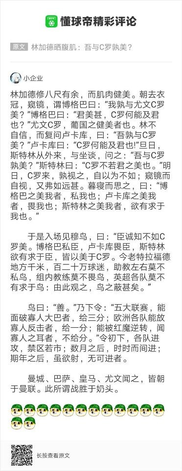 文言文鬼才?来看我懂用户原创《林加德讽穆里尼奥纳谏》 D站那些事儿 2018-11-09 08:15昨天欧冠在完成破门之后,C罗跑向了场边进行了晒腹肌的庆祝动作。而比赛结束之后,曼联球星林加德也在推特上晒出了自己的腹肌,并且让球迷们进行比较:吾与C罗孰美?【林加德晒腹肌:吾与C罗孰美?】于是就有了我懂文言文鬼才@小企业 在评论区的一篇《林加德讽穆里尼奥纳谏》...皆九年之学,论秀,吾不及汝...展开更多