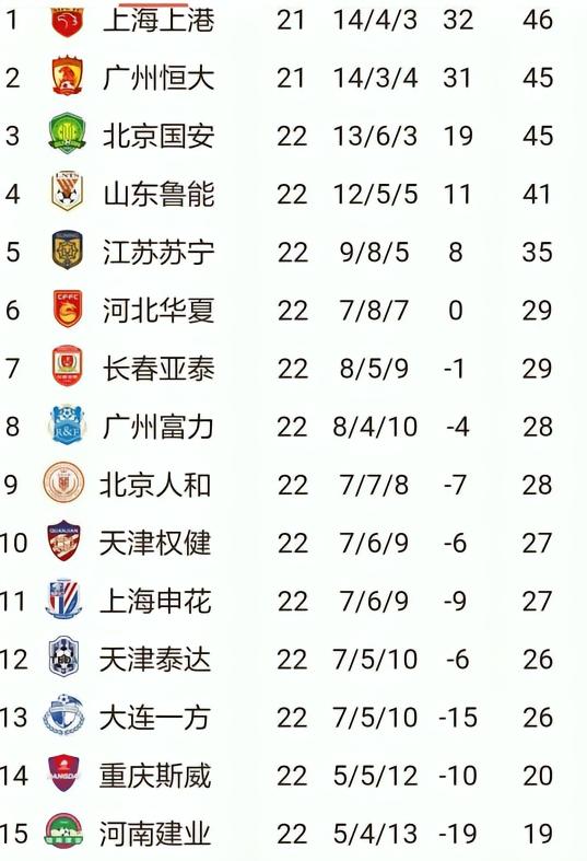 从第六名的华夏幸福到倒数第二的河南建业,总共只有10分的差距
